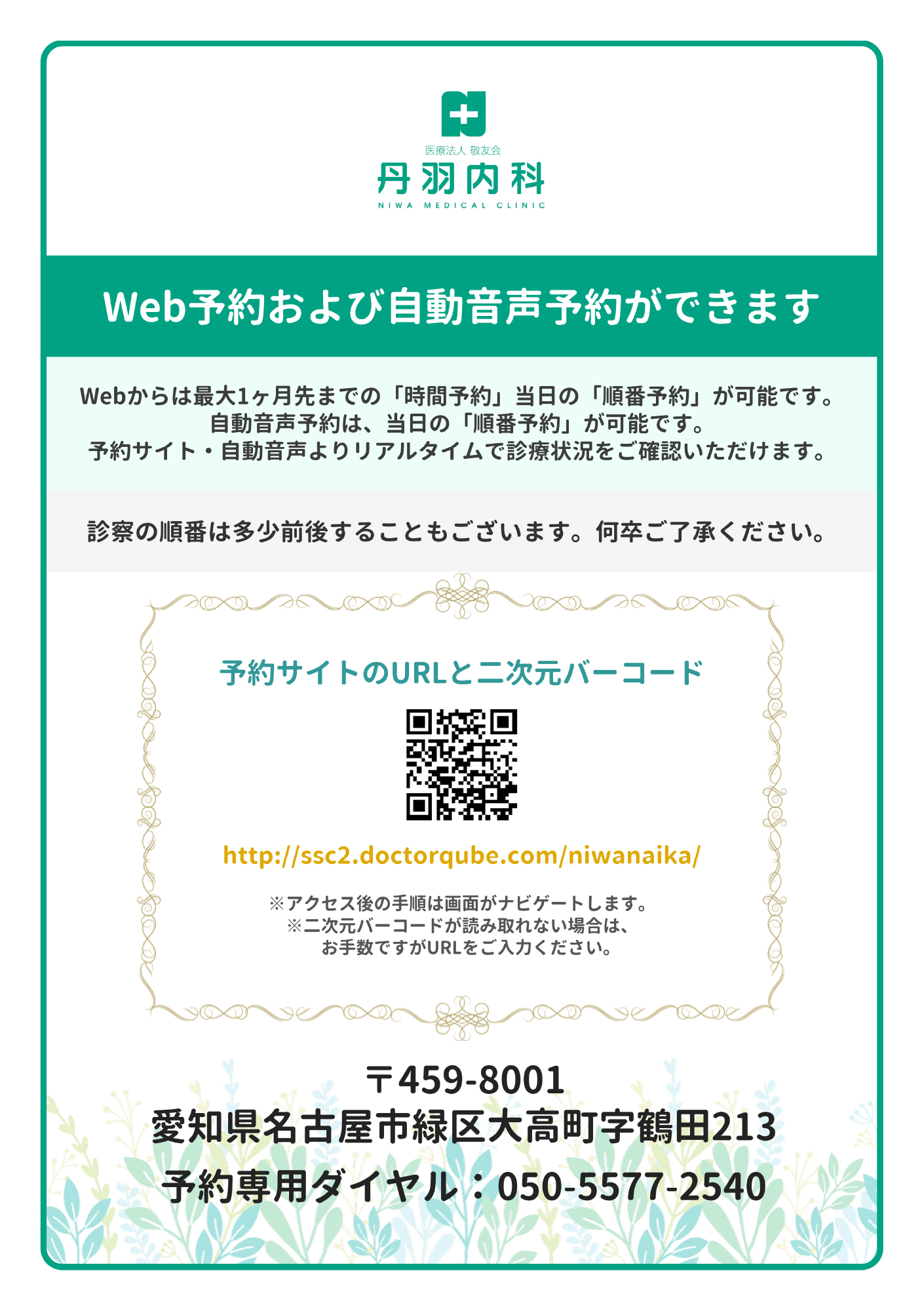 予約は丹羽内科へお電話(052-624-1600)、受付にてお取りください。